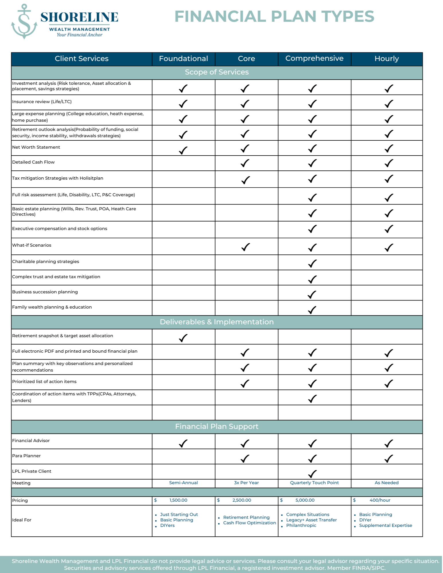 - Here at Shoreline we customized investment strategy and financial plans tailored to you, with ongoing active management. Our team works with you, your loved ones and other professionals including CPAs and attorneys to provide a holistic approach.